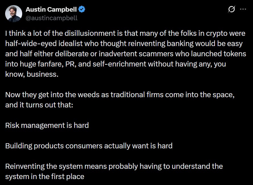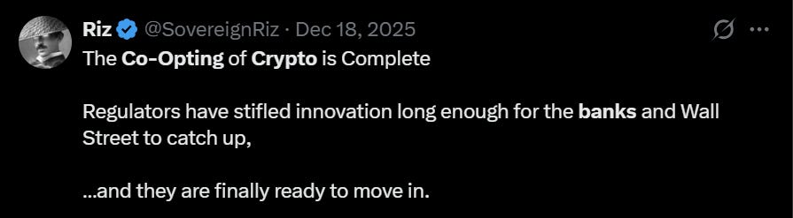 This moment is increasingly framed as a form of capture. Token prices, long treated as proxies for adoption and success, have fallen meaningfully from prior highs. Public blockchain ecosystems appear sidelined as incumbents adopt the technology on their own terms. The conclusion follows easily: crypto has been co-opted, and the open networks that once promised disruption are being rendered irrelevant.