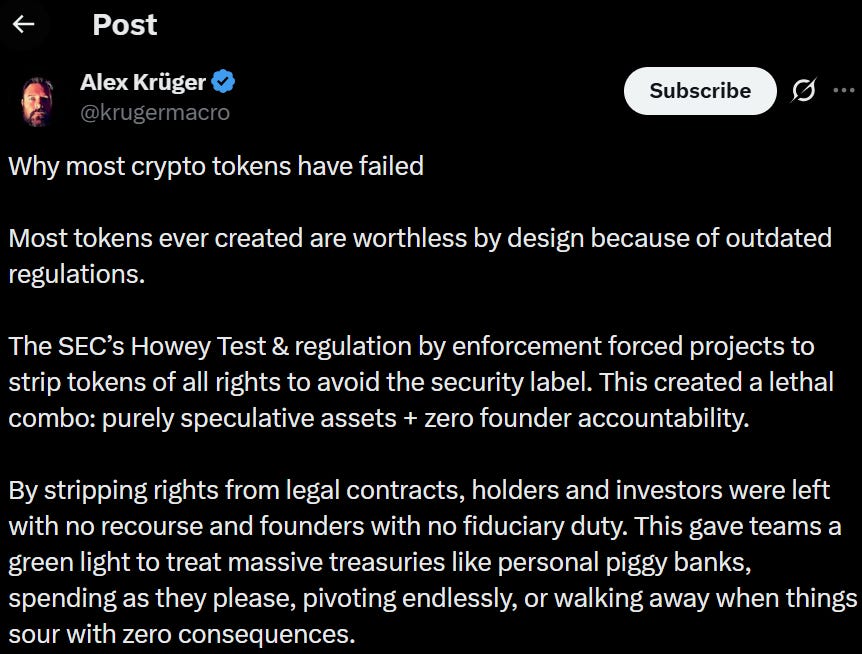 This narrative is understandable, but naive. It reflects disappointment more than diagnosis. What we are witnessing is not co-option, but repricing, as markets develop a clearer understanding of what tokens do, and just as importantly, what they do not represent.